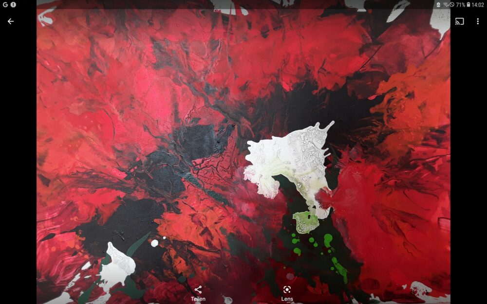 Inspiration waren die Farben des Mohns und gearbeitet wurde das Bild vom dunklen ins Helle. Das ergibt Tiefe und die kleinen Grünanteile heben das Rot.