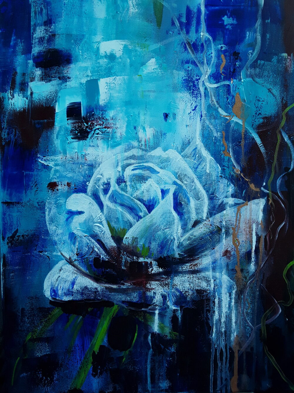 Wie schnell kann eine Rose kitschig werden....in diesem Fall nicht. Erreicht habe ich das a) durch die Farbwahl und b) durch den Einsatz eines Gummispachtels, mit dem ich das Kunstwerk final bearbeitet habe. Da weisse Rosen tendenziell farblich nicht gerade hervorstechen, geben hier die verschiedenen Blautöne farbliche Spannung. Die Blautöne gegeben dem Bild eine kühle Stimmung, die gespachtelten Party lassen es ein wenig i s abstrakte gehen.