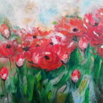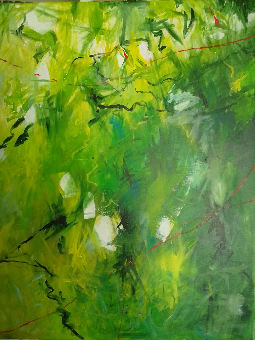 Wir haben im Leben immer mal Phasen der Veränderung. Das Alte geht, das Neue kommt. Manchmal erscheint das Leben wie ein Dickicht, ein schwer zu durchschauen der Dschungel. Wie hier, in vielen grünen Farbvarianten mit kleinen roten Akzenten, geheimnisvollen Lichtblicken. Die Linien und Formen sind nicht klar definiert, sondern eher weich und fließend, was der Szene einen surrealen, fast traumhaften Charakter verleiht.