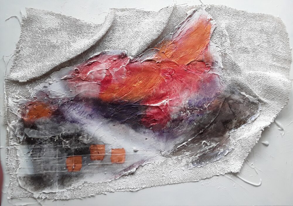 Feine und grobe Strukturen auf einer tiefen Leinwand. Verwendet wurden viele verschiedene Materialen, das "grobe" verkörpert die Jute, der Sumpfkalk mit seiner rissbildung und die kupferfolie geben demn werk etwas Edles. Ein ganz eigener Stil, die Farben gedämpfte rot- und grautöne, harmonisch, interessant, subtil. Es lädt zum Erkunden ein, zum Verweilen des Auges auf den Werk. Die Künstlerin liebt es, verschiedene Materialien hemmungslos miteinander zu vermischen. Denn der Kreativität sind keine Grenzen gesetzt.