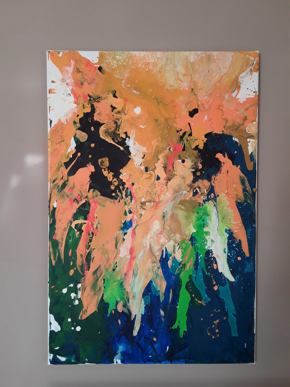Hier wurde wieder geschüttet. Das heißt: Farbe wird verdünnt bis sie fliessfähig ist. Dann wird sie auf gezielt und die Leinwand geschüttet. Wenn man das farbverhalten kennt, kann man das Ergebnis sehr wohl beeinflussen. Manche Farben sind schwerer, andere leichter.  Manche basierend, andere deckend.