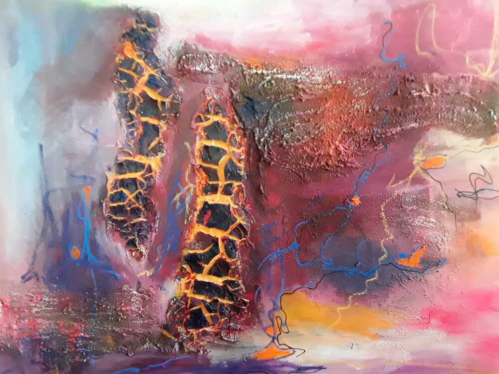 Tiefe, glühende Farben, viele Lila- und Violettöne sowie verschiedene Strukturen aus Rissen und Sand machen dieses Bild zu einem Hingucker. Den Kern bilden die zwei "Figuren" aus einer speziellen Paste, die beim trocknen Tiefe Risse bildet. Weiter strukturiert wurde es mit Sand als Strukturelement. Strukturen sind ein Lieblingsthema der Künstlerin. Das Bild glüht einem förmlich entgegen. Die Farben sind breit gefächert, wir finden mindestens 5 verschiedene Violett-und lilatöne, pink, kobaldblau, orange, rosa in kräftigen Pinselstrich. Weiter bearbeitet wurde es mit Ölkreide in lockerem "gekritzel".