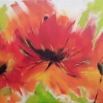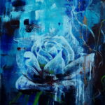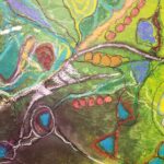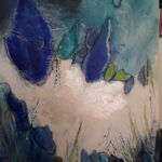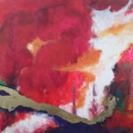Tiefe, glühende Farben, viele Lila- und Violettöne sowie verschiedene Strukturen aus Rissen und Sand machen dieses Bild zu einem Hingucker. Den Kern bilden die zwei "Figuren" aus einer speziellen Paste, die beim trocknen Tiefe Risse bildet. Weiter strukturiert wurde es mit Sand als Strukturelement. Strukturen sind ein Lieblingsthema der Künstlerin. Das Bild glüht einem förmlich entgegen. Die Farben sind breit gefächert, wir finden mindestens 5 verschiedene Violett-und lilatöne, pink, kobaldblau, orange, rosa in kräftigen Pinselstrich. Weiter bearbeitet wurde es mit Ölkreide in lockerem "gekritzel".