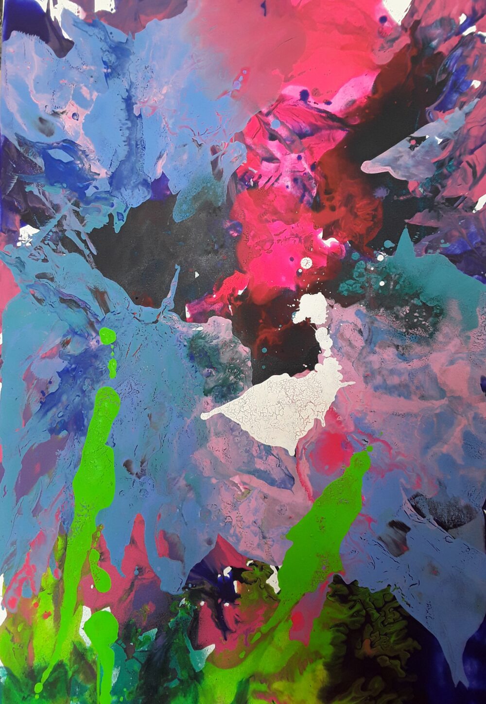 • Reine Schüttungen ohne jeden Pinselstrich Kennzeichen dieses Bild. In kräftigen Blautönen, akzentuiert wurde mit Magenta und Grün. Es leuchtet und die Farben,  die sich im zähflüssigen Zustand vermischen machen es lebhaft und elegant und fangen den Blick ein. Es macht Spass,  immer wieder neue Ecken zu entdecken. Eine kostbare dekoration für jeden raum.