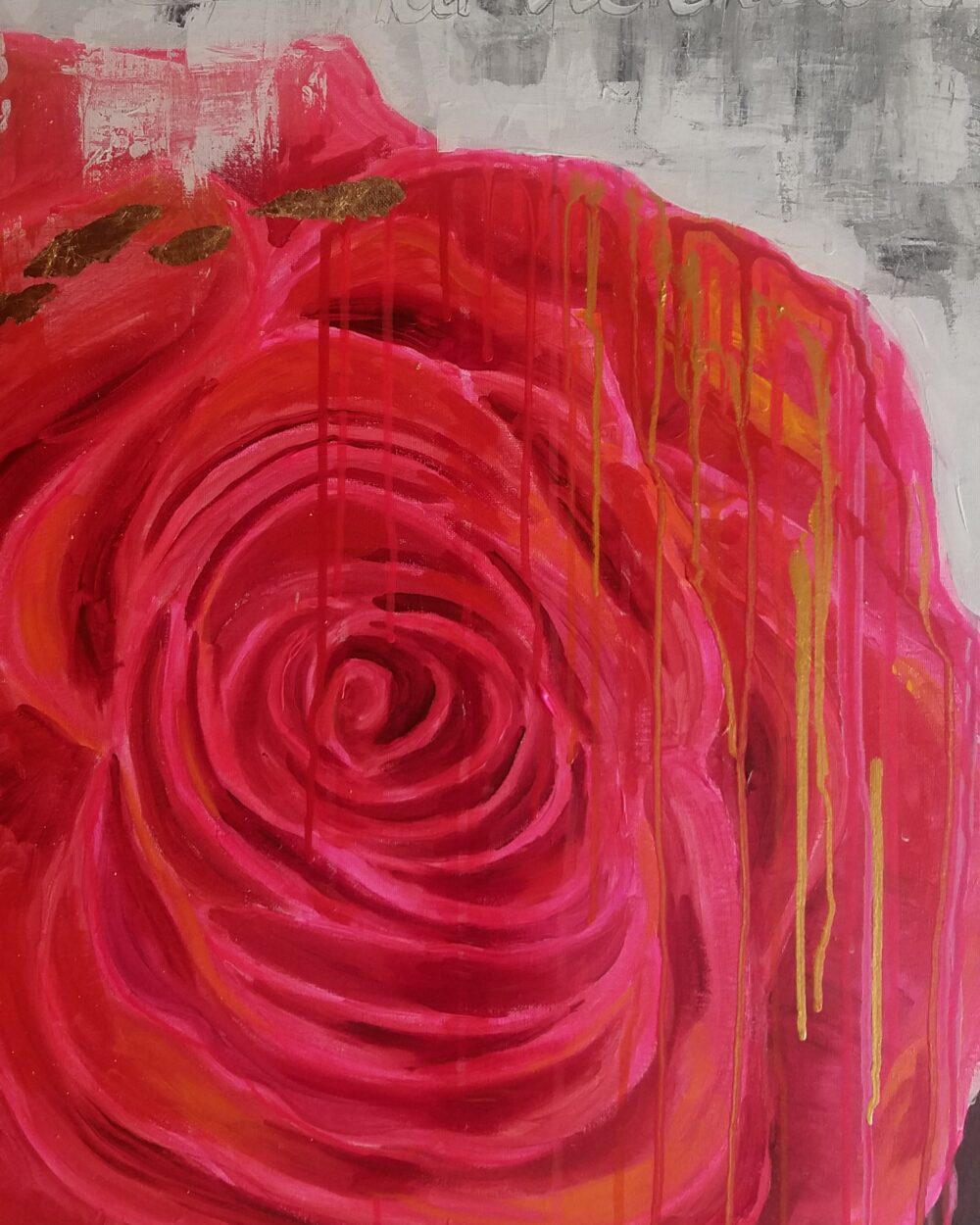 Die Blume der Liebe steht hier für ein Leben, dass sich auch nach schlechten Tagen wieder aufrichtet. Denn jeder Schmerz, jedes Leid vergeht. Freundliche, fröhliche und kräftige Farben bilden einen Blickpunkt in jedem Raum. Das Format ist bewusst relativ klein gehalten, denn die voll erblühte Rose in ihren Farben würde sonst unsere eher kleinen Räume überfrachten. Inspiriert hat die Künstlerin eine der wohl letzten Rosen im Garten vor einer Bäckerei. So banal kann Inspiration manchmal sein