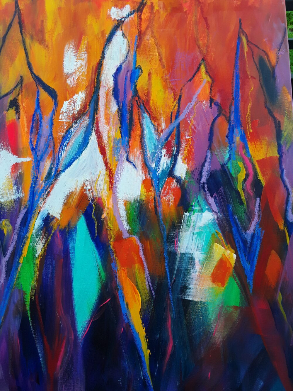Dieses Werk entstand spontan, der Eindruck kam von einem Plakat zum Thema Diversität. ich dachte mir: wie stell ich das denn der auf eine abstrakte Weise? Das, was unser Leben so bunt macht sind die verschiedenen Wege, die alle Menschen gehen und alles strebt nach oben